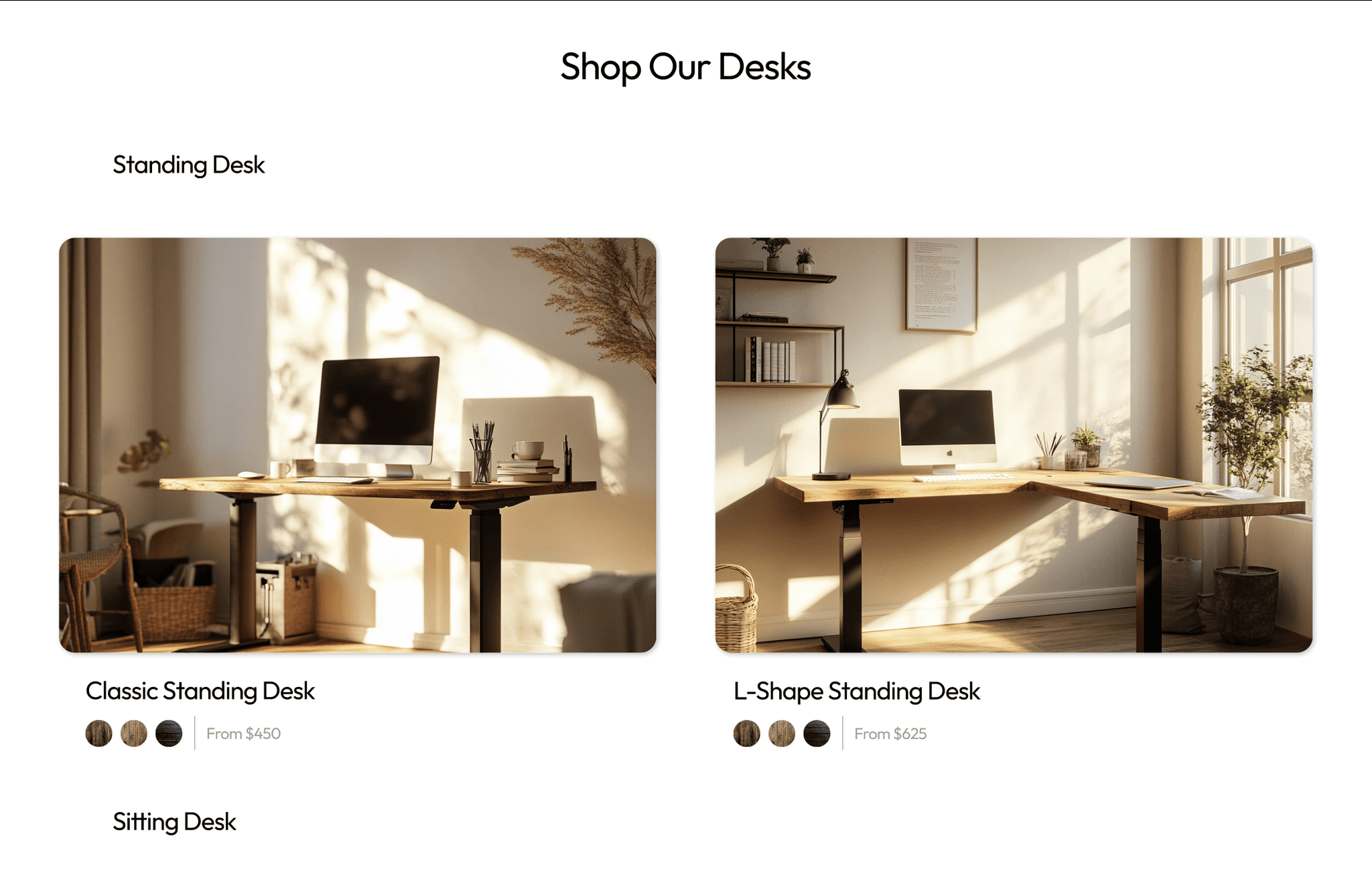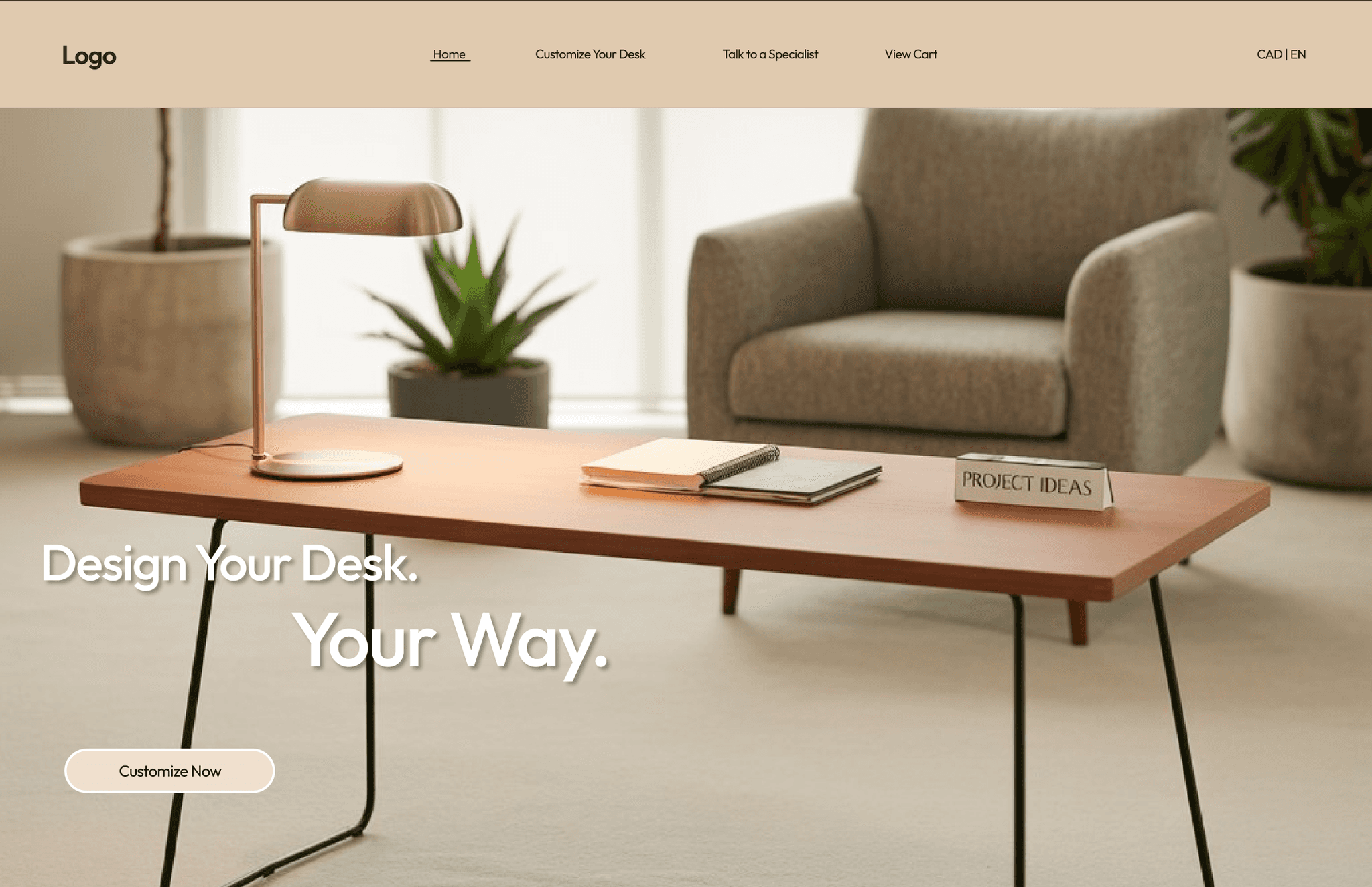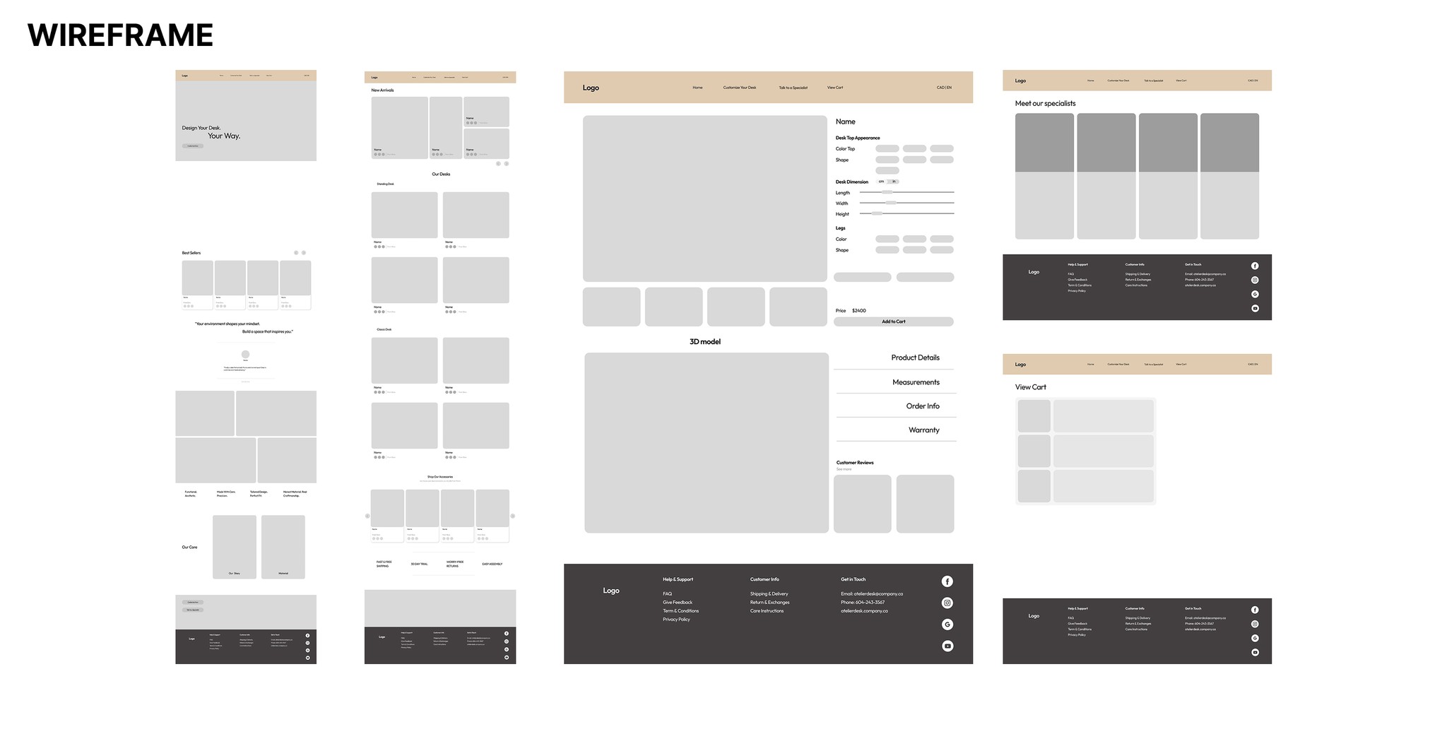 To establish the structure of Deskly, I created low‑fidelity wireframes that mapped out the core shopping flow. These wireframes focused on key pages such as the homepage, product catalog, product customization, talk to specialists with chat box pop-up, and checkout, ensuring the layout supported a clear and intuitive user journey. By defining hierarchy and navigation early, I was able to visualize how users would explore desks and accessories before moving into high‑fidelity design.