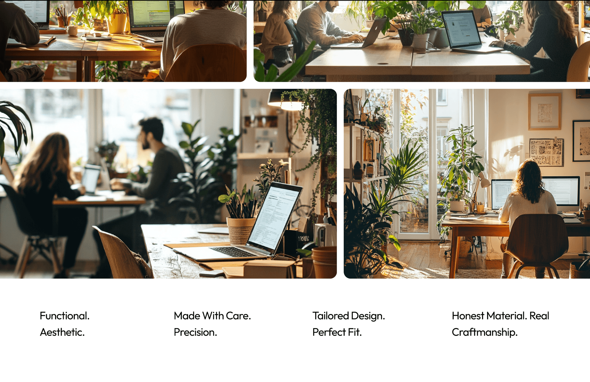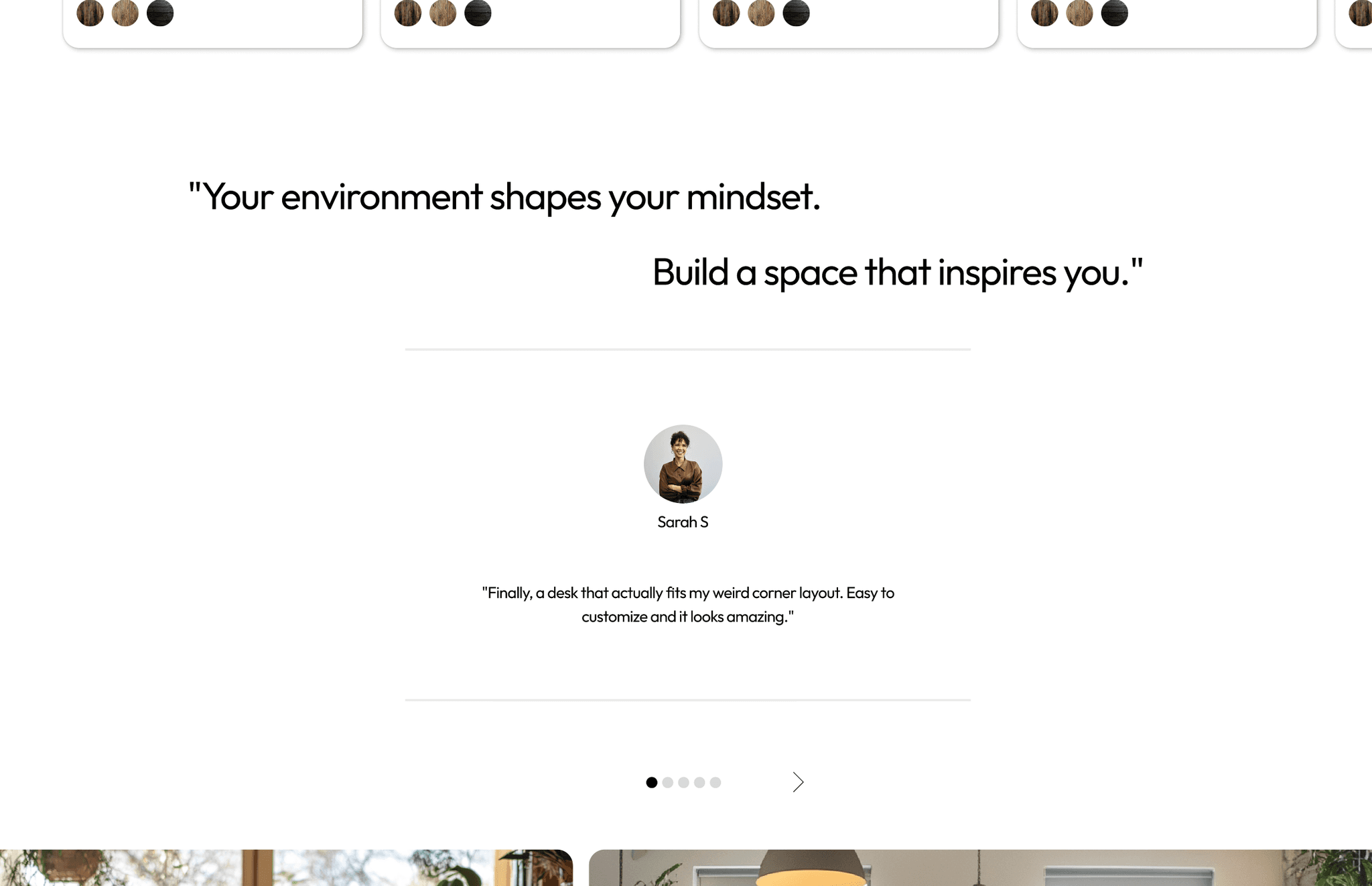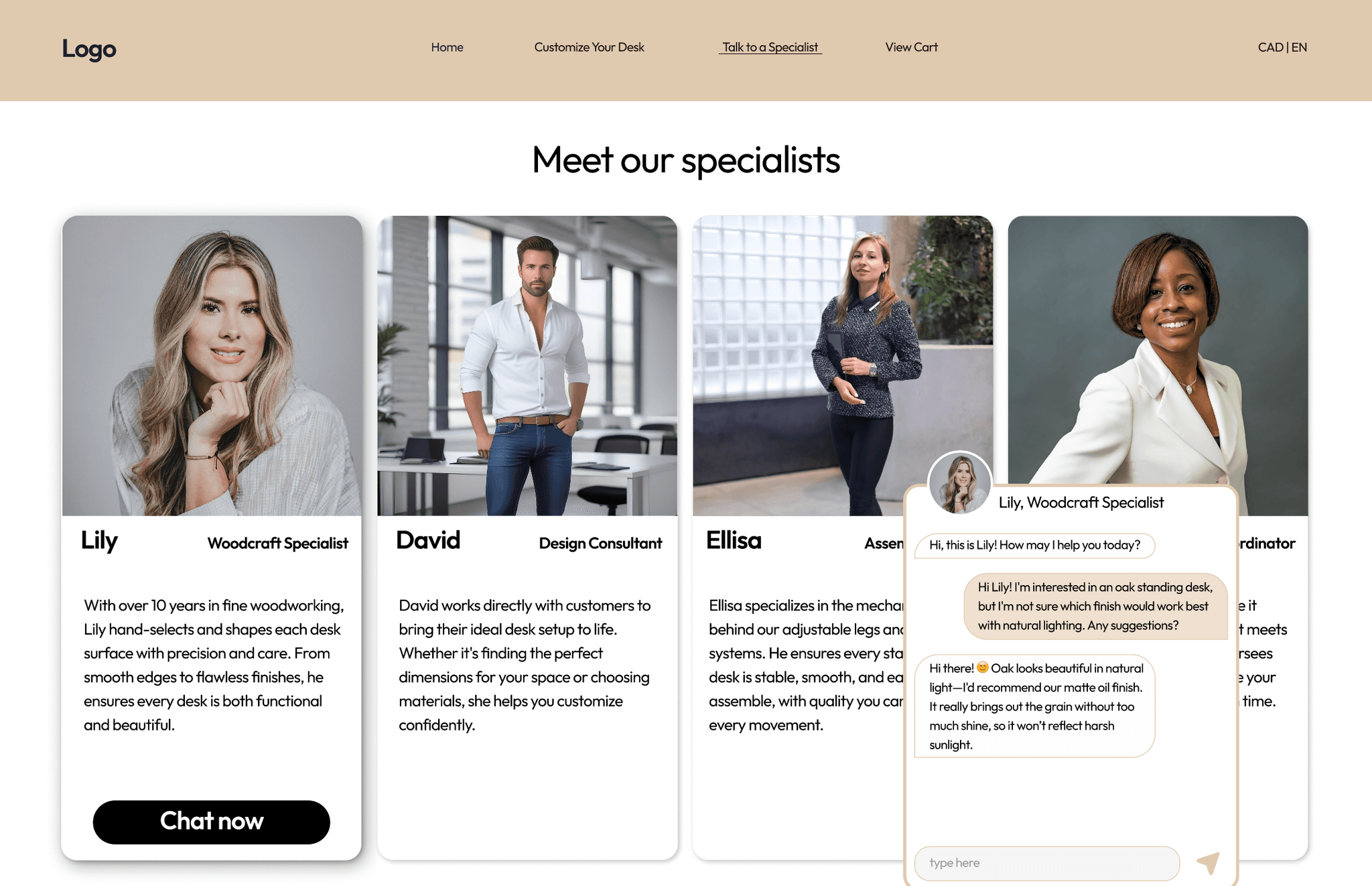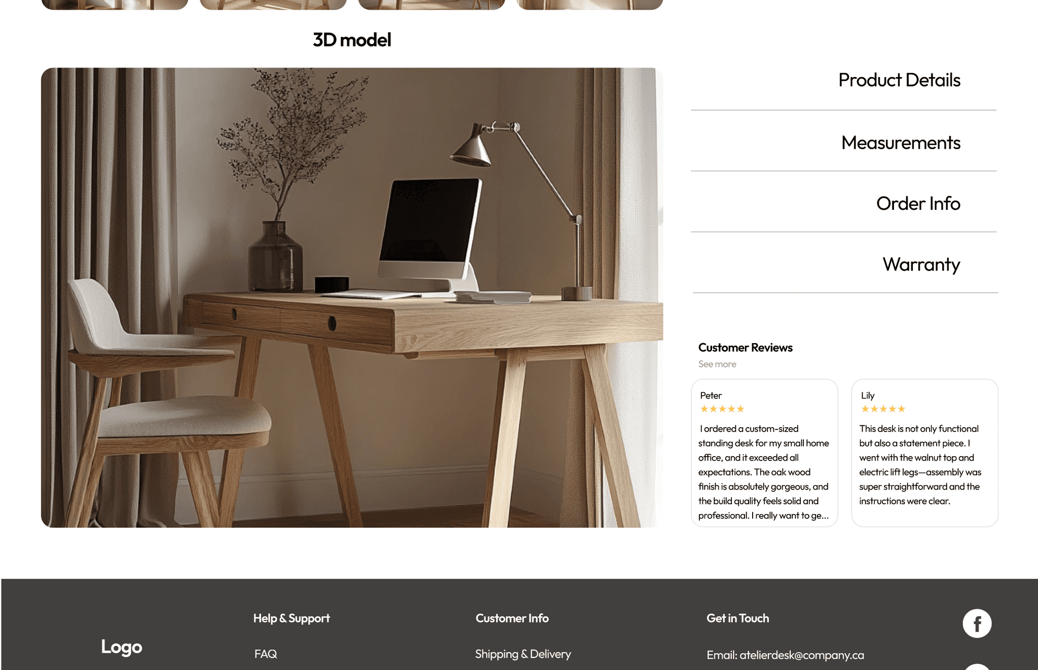 To establish the structure of Deskly, I created low‑fidelity wireframes that mapped out the core shopping flow. These wireframes focused on key pages such as the homepage, product catalog, product customization, talk to specialists with chat box pop-up, and checkout, ensuring the layout supported a clear and intuitive user journey. By defining hierarchy and navigation early, I was able to visualize how users would explore desks and accessories before moving into high‑fidelity design.