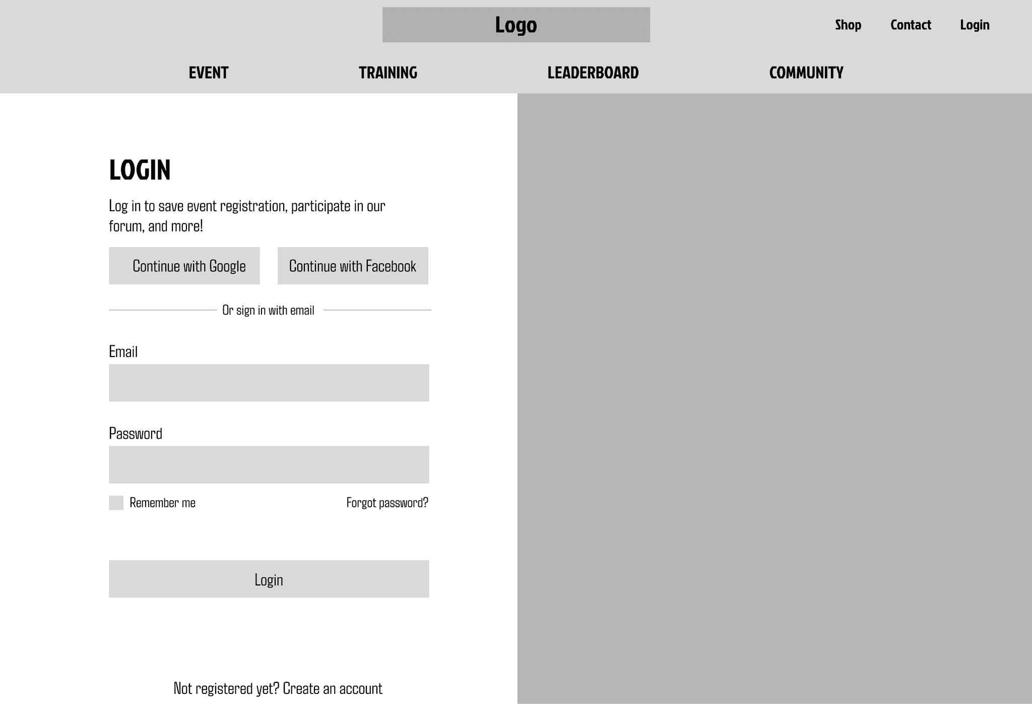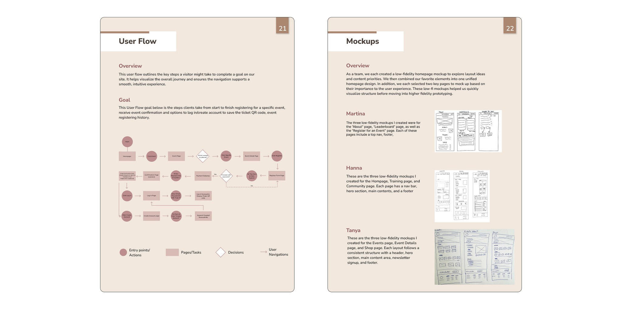 After sketching our assigned pages, we built digital wireframes to shape the full site experience. I designed five key pages - including the homepage, events, and training, while teammates contributed the remaining sections, including login and account creation. For the interactive prototype, I kept the shared navigation but only linked the pages I designed, ensuring the prototype felt cohesive while highlighting my individual contributions.