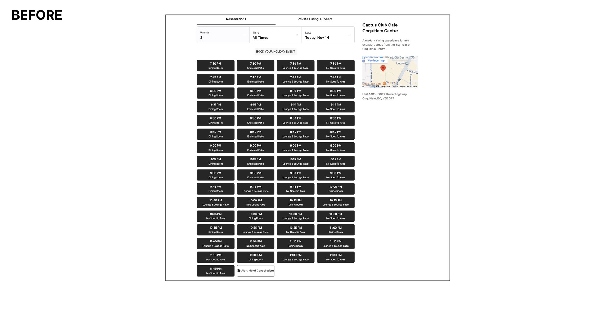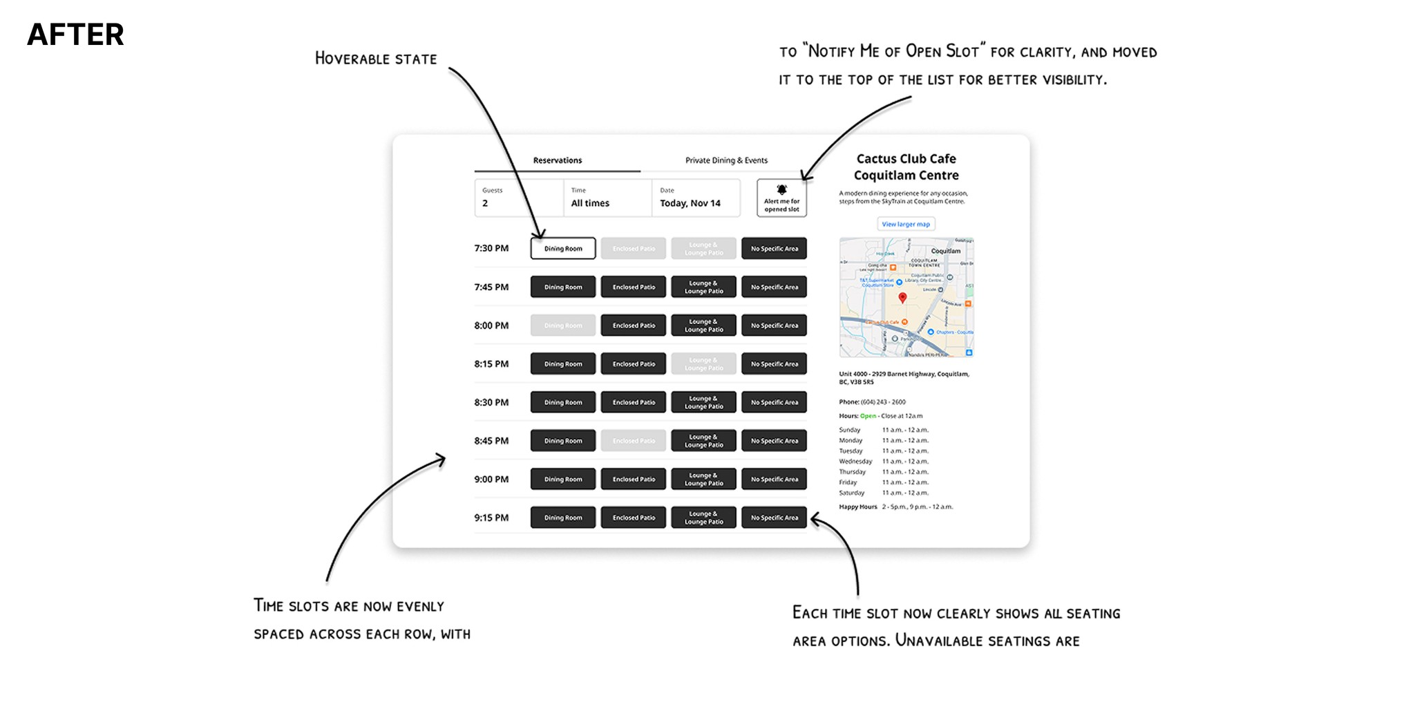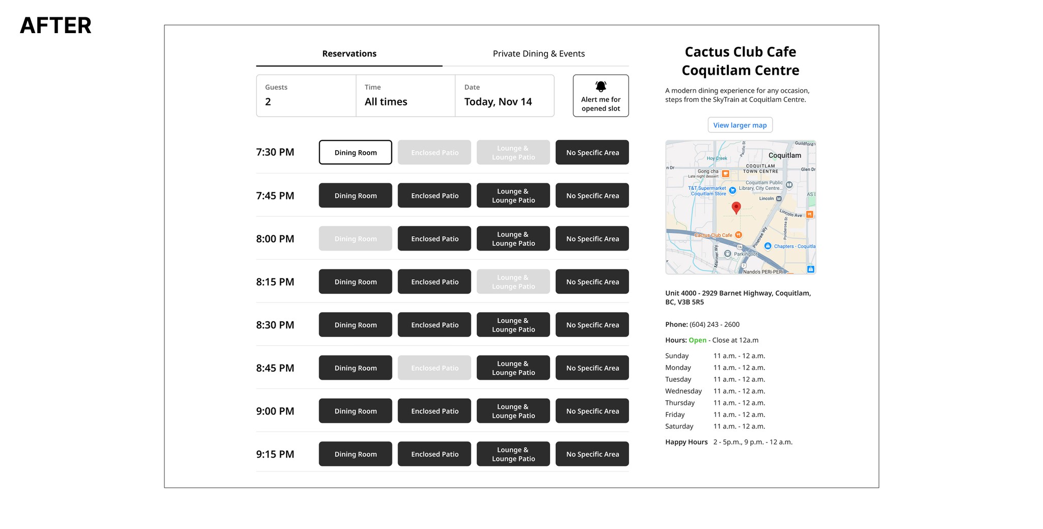 Time slots are now grouped into single rows with seating options displayed side by side, eliminating repetitive listings and reducing visual noise. Unavailable options are dimmed for quick recognition, and the alert feature has been repositioned and renamed to improve clarity. Together, these updates help users compare options at a glance and complete their reservation with confidence.