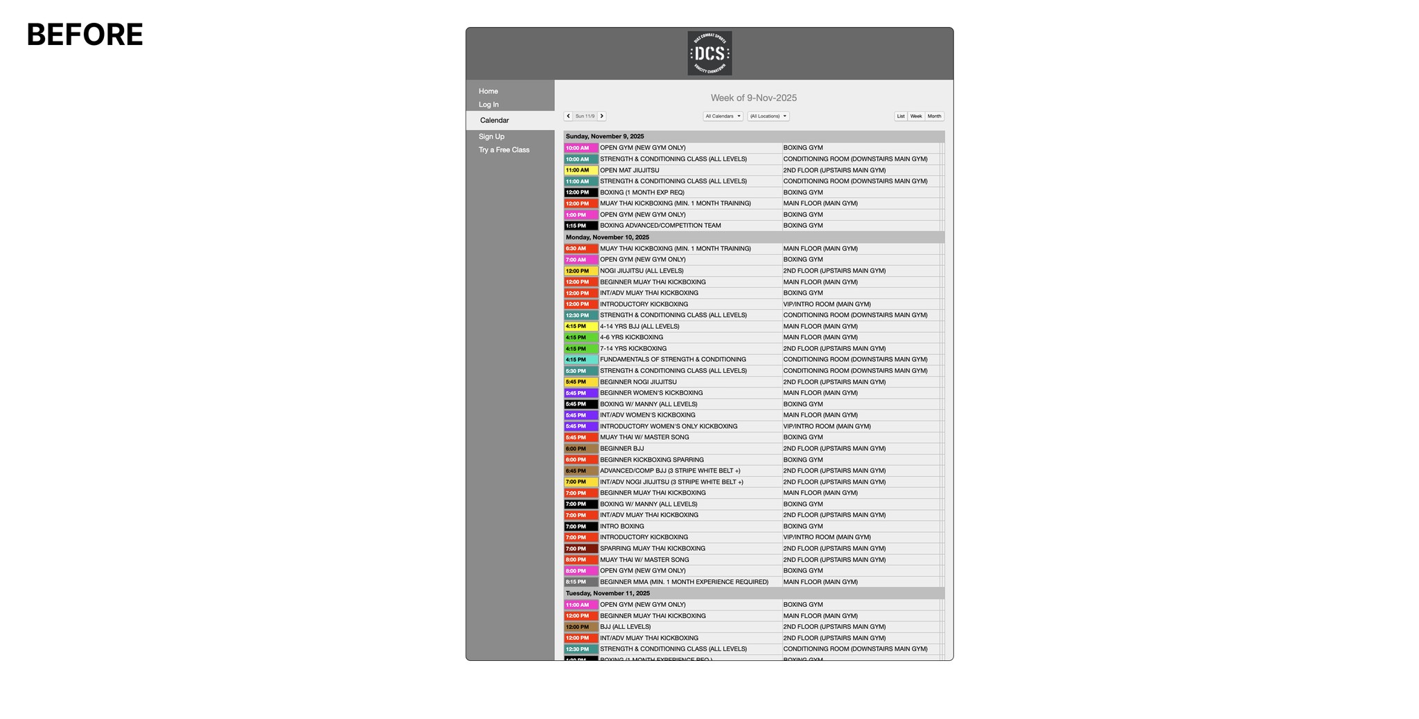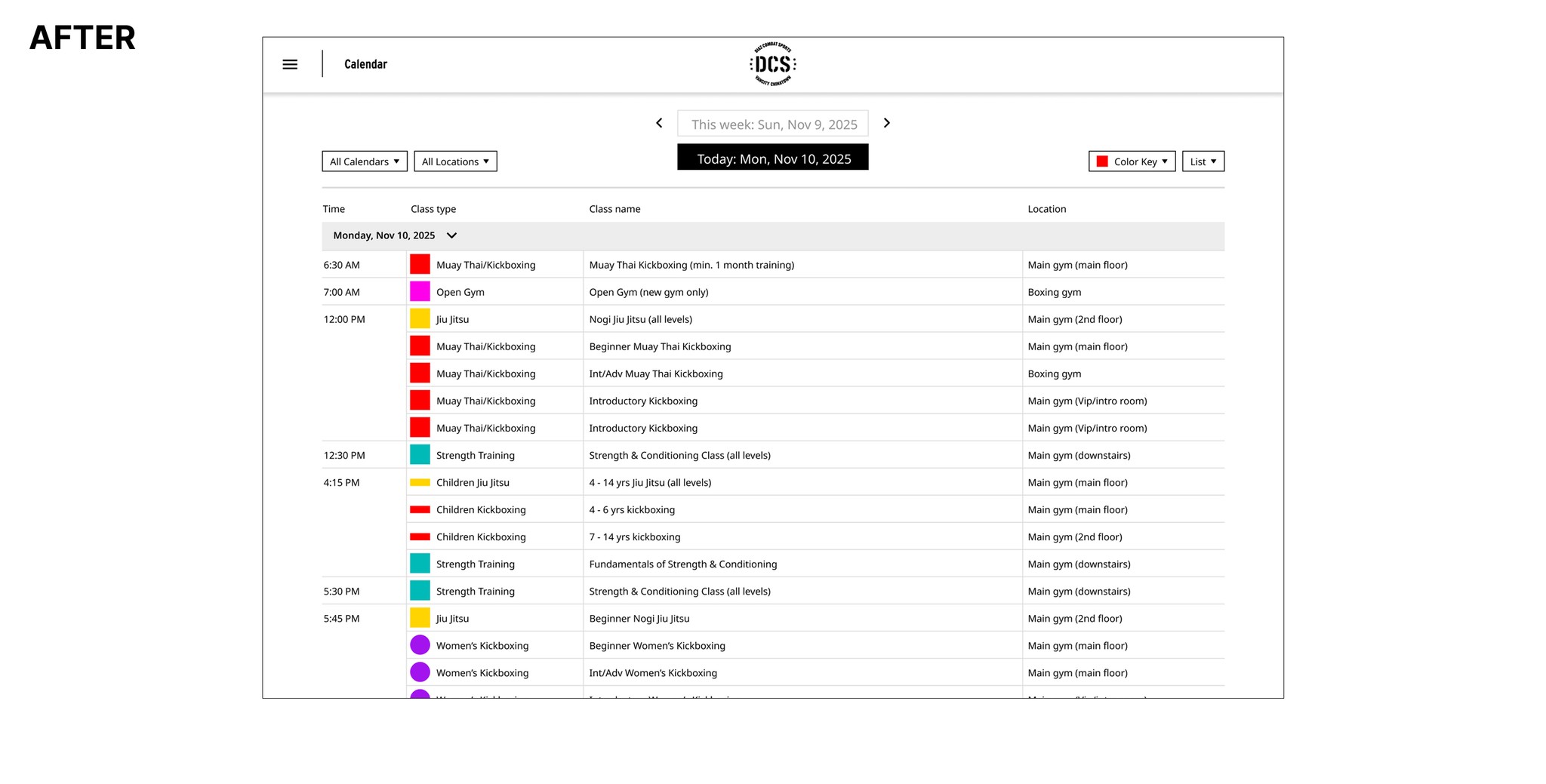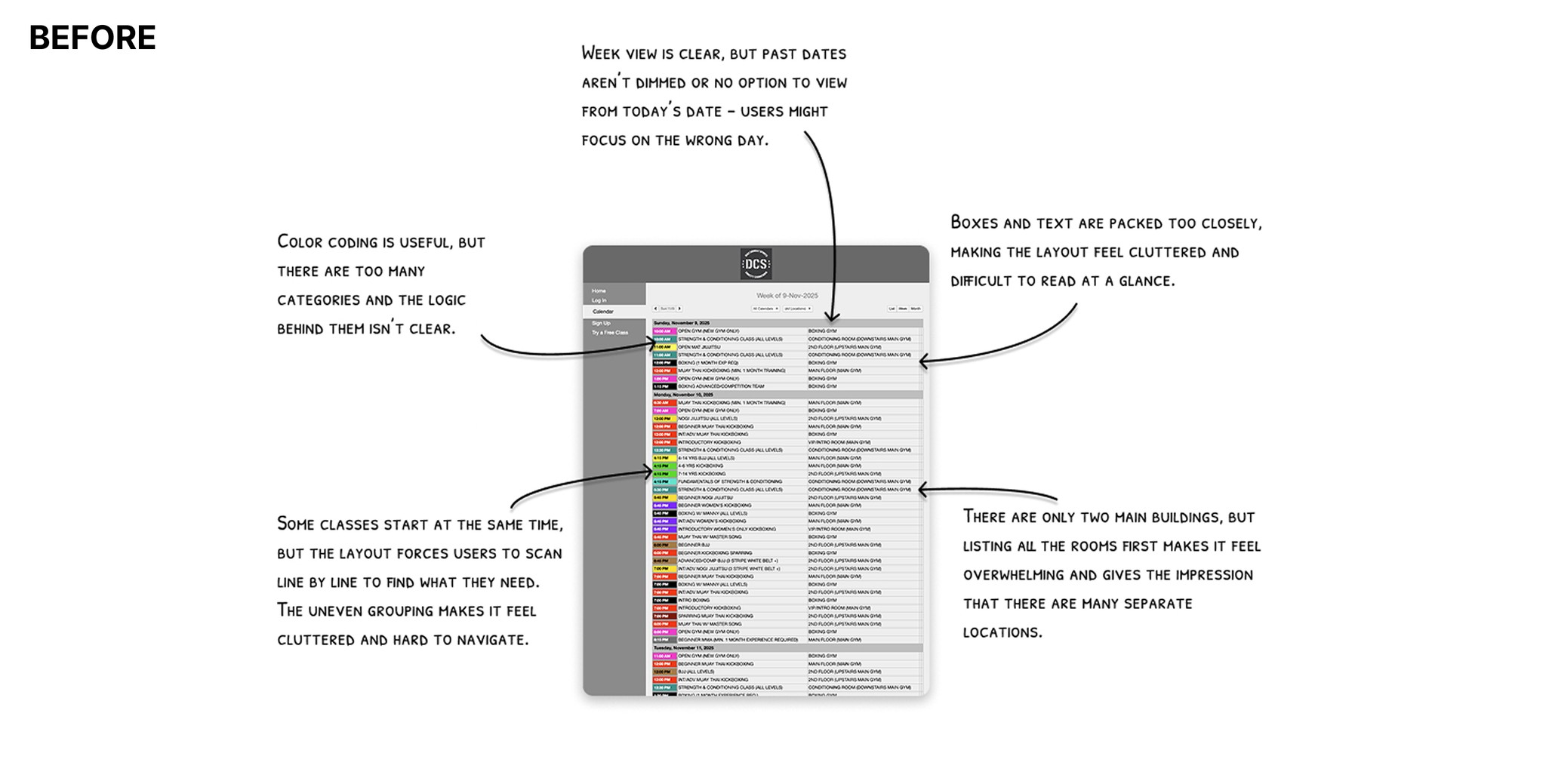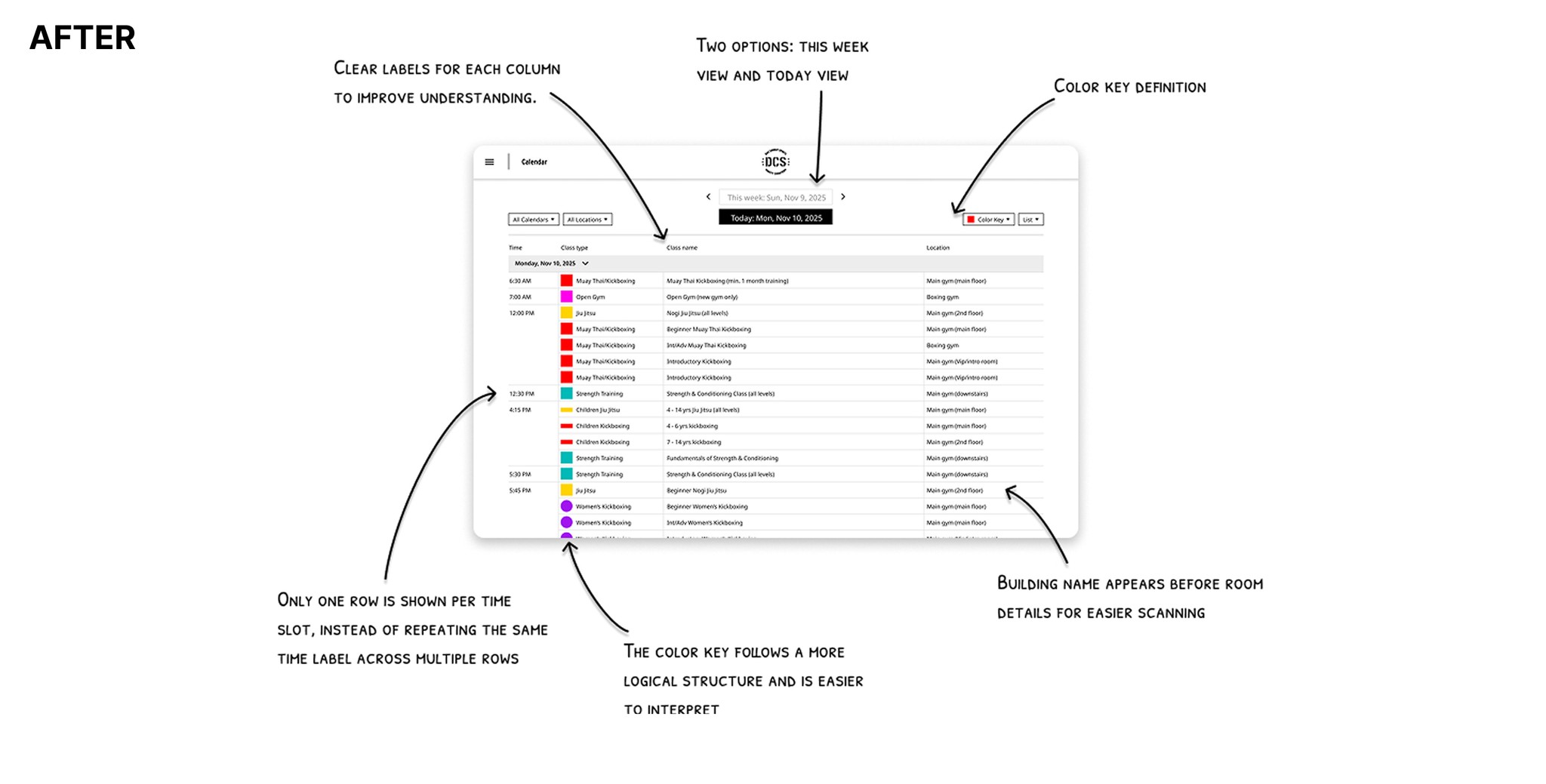 The redesign improves usability by distinguishing past dates, adding helpful view options, increasing spacing, simplifying color‑coding with shape indicators, reducing repetitive time labels, and prioritizing building names for faster scanning.